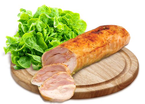 Запеченный деликатесный продукт, состоящий преимущественно из филе бедра индейки, воды, нитритной соли, специй (чеснок, перец) и пищевых добавок (каррагинан, трифосфаты) для структуры и сочности.