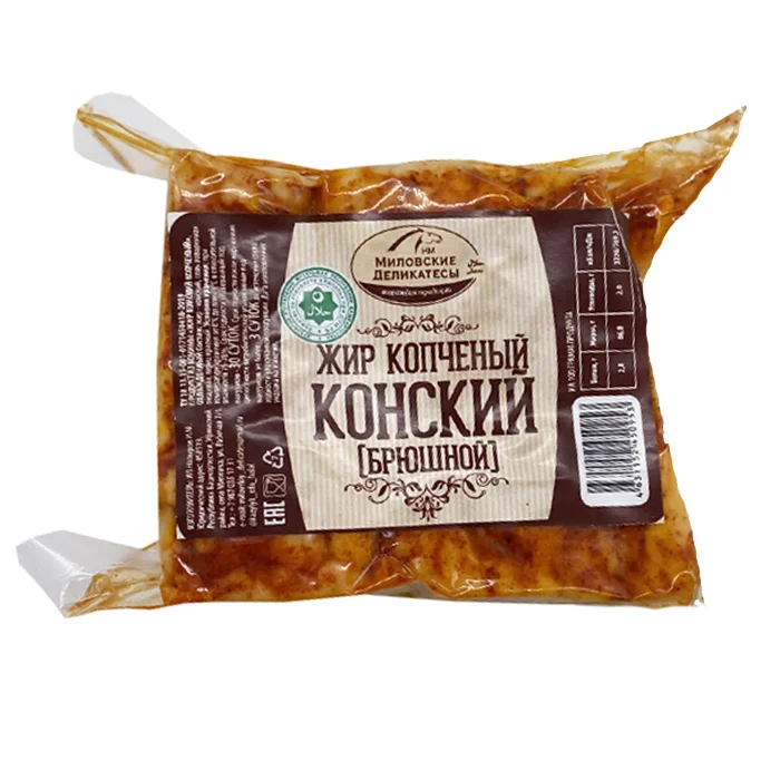 Производится из брюшной части конины, имеет выраженный аромат копчения и поставляется в вакуумной упаковке, сохраняя свежесть до 30 суток (при t 0_+2°C).